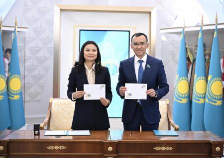 «Қазпошта» АҚ басқарма төрағасы Әсел Жанасова мен Қазақстан Республикасы Парламенті Сенатының Төрағасы Мәулен Әшімбаев пошта маркасына белгі қоюға арналған салтанатты шараға қатысты.