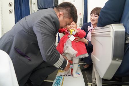 Авиация тарихында алғаш рет QAZAQ AIR әуе компаниясының бортында бала өміріндегі жаңа кезеңнің басталуын бейнелейтін «Тұсау кесер» ұлттық рәсімі өткізілді.
