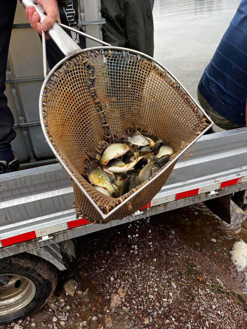 Сотрудники Чиликского прудового хозяйства, одного из старейших в стране, доставили рыбу и следили за её состоянием. Для них это дело привычное, но всё же ответственное: ведь они знают, что каждая выпущенная рыбка - вклад в общее дело сохранения природы.