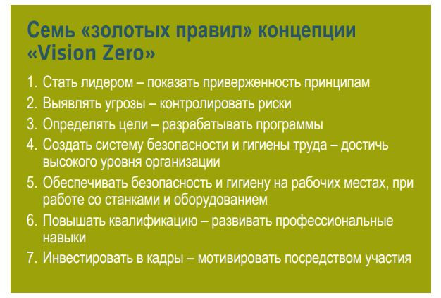 Система управления охраной труда «Vision Zero» основывается на семи правилах, понимание и соблюдение которых должны привести к повышению промышленной безопасности и снижению травматизма на всех уровнях производств. В АО «АлЭС» разработана Программа по реализации концепции «Vision Zero» на 2023 года, в которую включены мероприятия раздельно по каждому правилу.