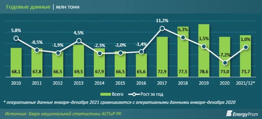 С января по декабрь 2021 года предприятия добыли 73,7 млн тонн нефти (+1%).