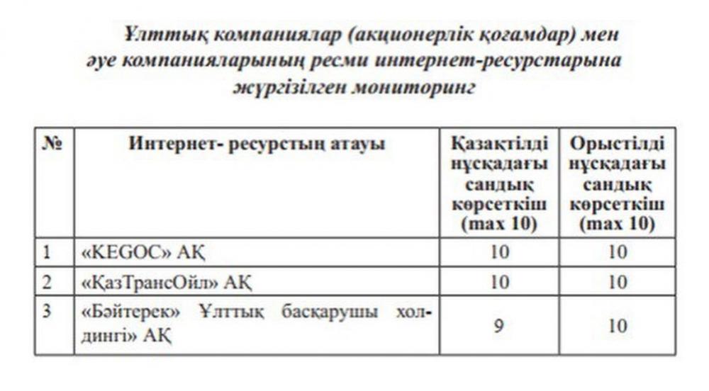 Ұлттық компания ресми сайттарының мемлекеттік тілде берілген ақпараттың толықтығы мен өзектілігі бағаланды.