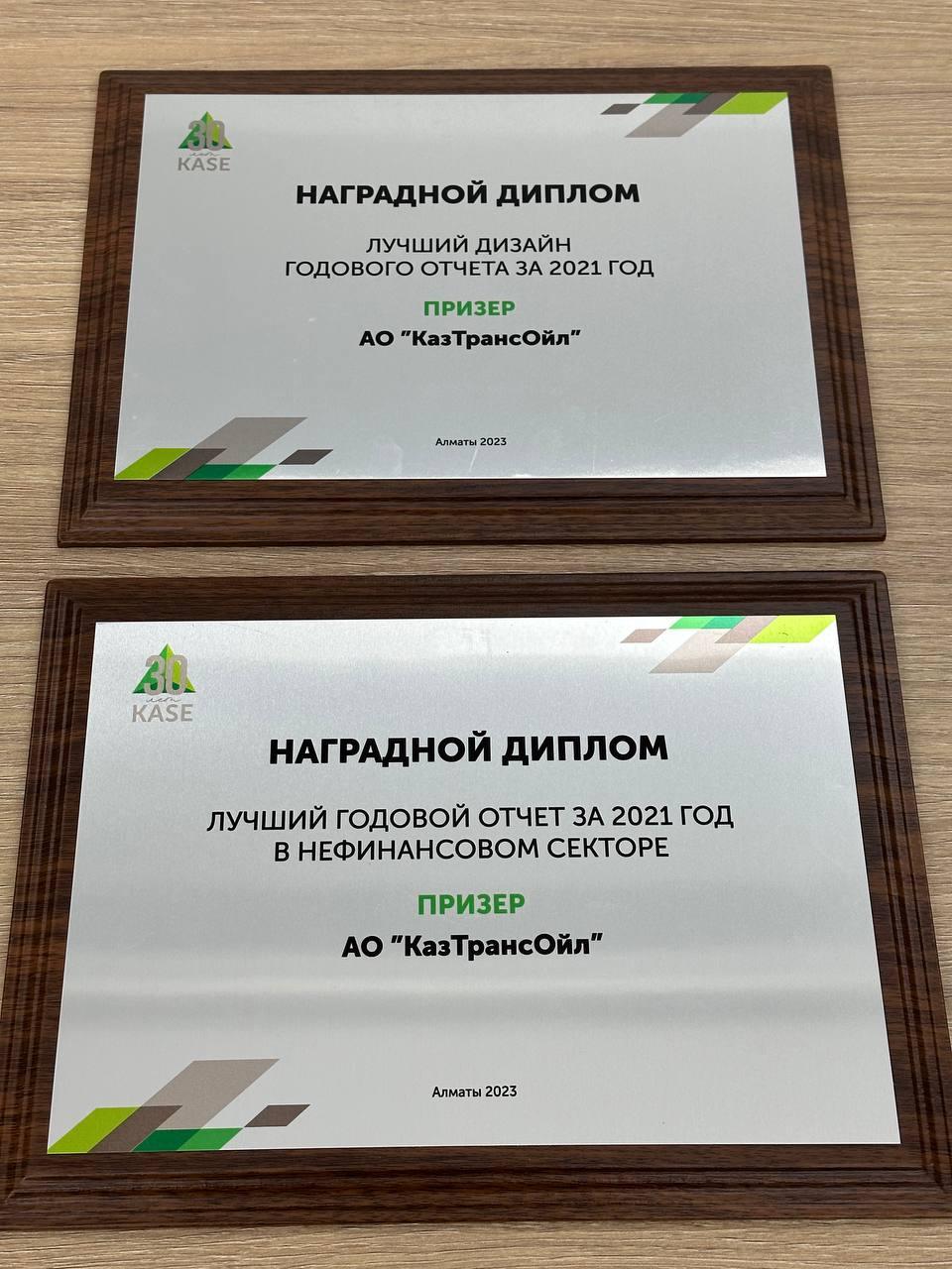 «ҚазТрансОйл» АҚ жылдық есебі Қазақстан қор биржасы (KASE) өткізетін жыл сайынғы конкурс аясында 2021 жылға арналған қызмет нәтижелері бойынша «Қаржылық емес сектордағы үздік жылдық есеп» номинациясында жеңімпаз атанды. Сондай-ақ «ҚазТрансОйл» АҚ «2021 жылға арналған жылдық есептің үздік дизайны» номинациясы бойынша дипломға ие болды. Марапаттау рәсімі 2023 жылдың 17 ақпанында Алматы қаласында өтті.