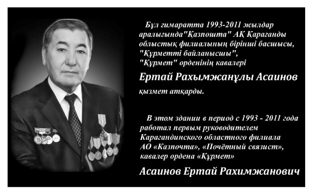 Қарағандыдағы «Қазпошта» облыстық филиалы ғимаратының қабырғасына оның бірінші басшысы, Құрметті байланысшы және «Құрмет» орденінің кавалері Ертай Асайыновқа мемориалдық тақта орнатылды.