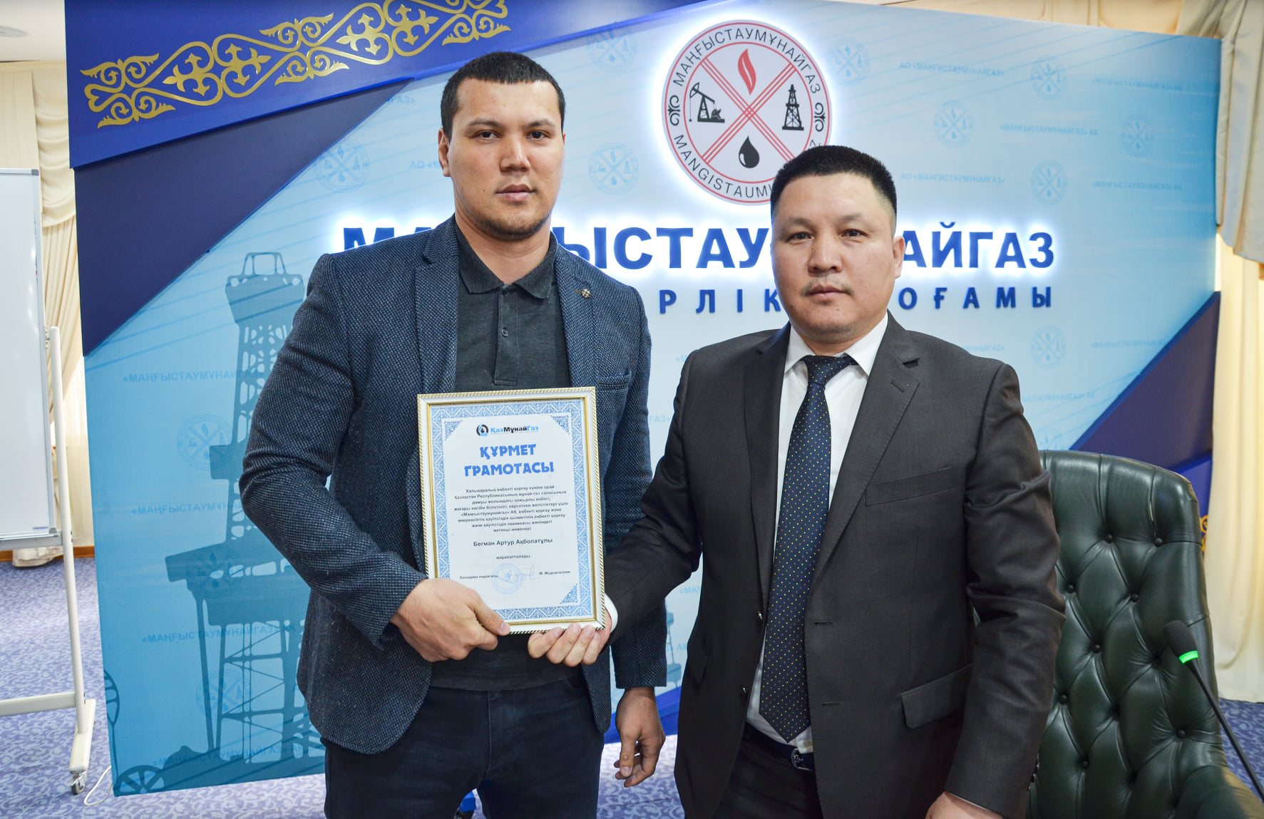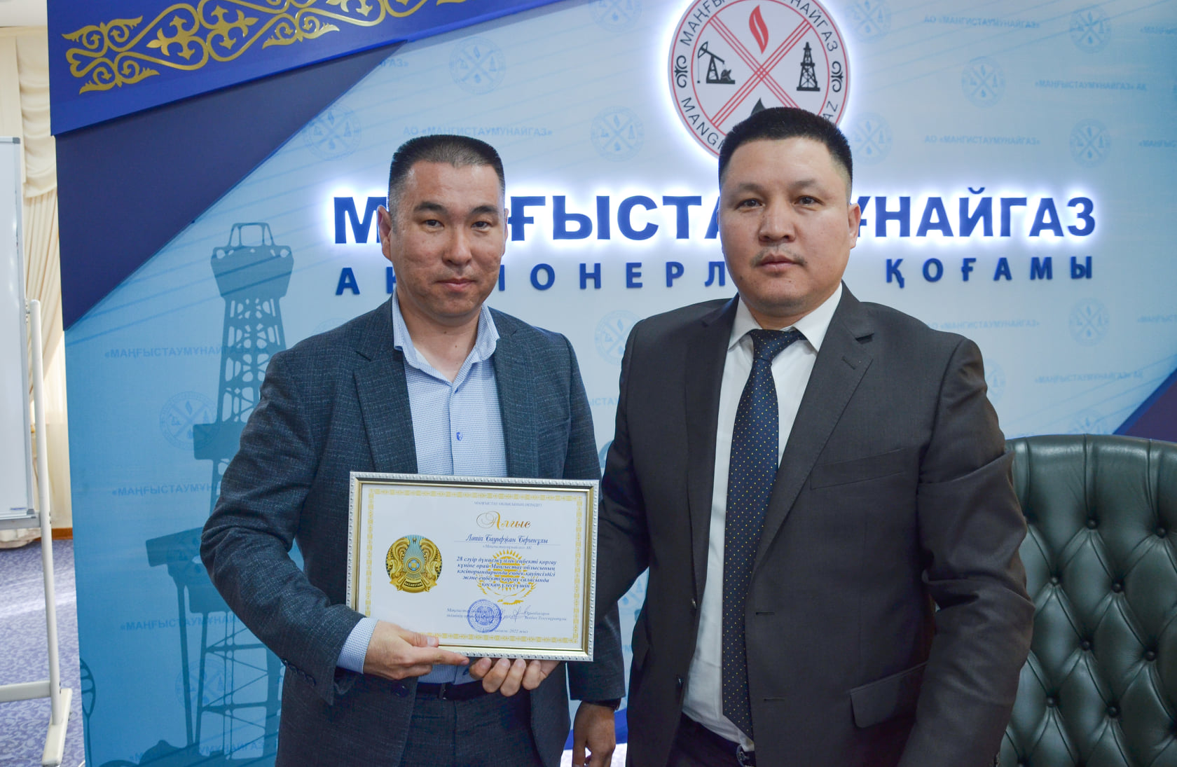 Дүниежүзілік еңбекті қорғау күніне орай, еңбекті қорғау және қауіпсіздік техникасын нығайтуға қосқан зор үлесі үшін «Қазмұнайгаз» ҰК» АҚ еңбекті және қоршаған ортаны қорғау департаментінің директоры Қайрат Сақтағанов «Маңғыстаумұнайгаз» АҚ бір топ қызметкерлеріне Алғыс хаттар мен Құрмет грамоталарын тапсырды.