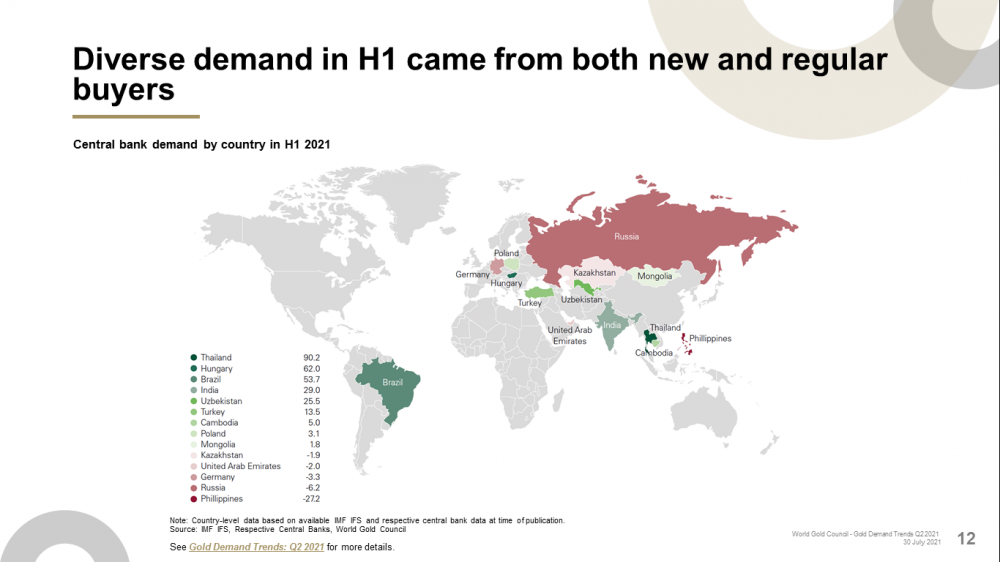 В соответствующей когорте стран также оказались центробанки ОАЭ (-2 тонны), Германии (-3,3 т), России (-6,2 т) и Филиппин (-27,2 т). Примечательно, что общая чистая позиция по операциям центральных банков с золотом за аналогичный период была положительной. Странами-лидерами по приобретению золота стали Таиланд (90,2 т), Венгрия (62 т), Бразилия (53,7 т), Индия (29 т), Узбекистан (+25,5 т) и Турция (13,5 т), следует из данных Всемирного совета по золоту. Международные резервы страны в целом, включая активы Национального фонда в иностранной валюте (57,5 млрд долларов США), по предварительным данным, на конец июня 2021 года составили 92,5 млрд долларов США.
