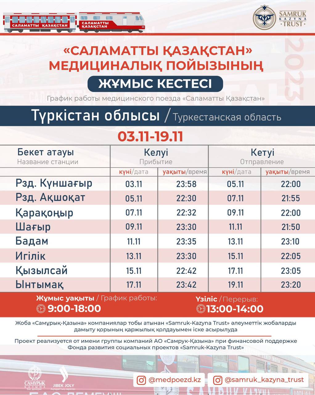 Түркістан облысынан кейін пойыз Жамбыл облысына аттанады. Ал, 6 желтоқсанда теміржолдағы денсаулық керуенінің қызметі қорытындыланады.