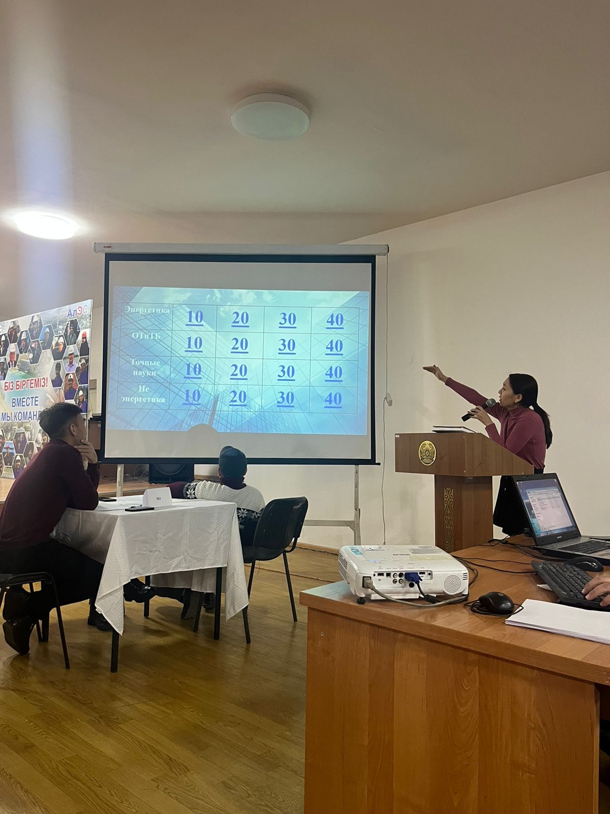 2. Второй раунд (формат "Выбери ячейку") – было 4 темы (энергетика, ОТиТБ, точные науки, не энергетика), и на каждую тему было 4 вопроса по уровню сложности (10,20,30,40 баллов). Команды по очереди выбирали ячейку и отвечали на вопрос.