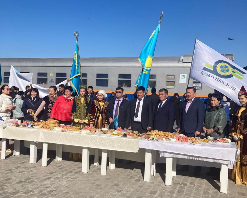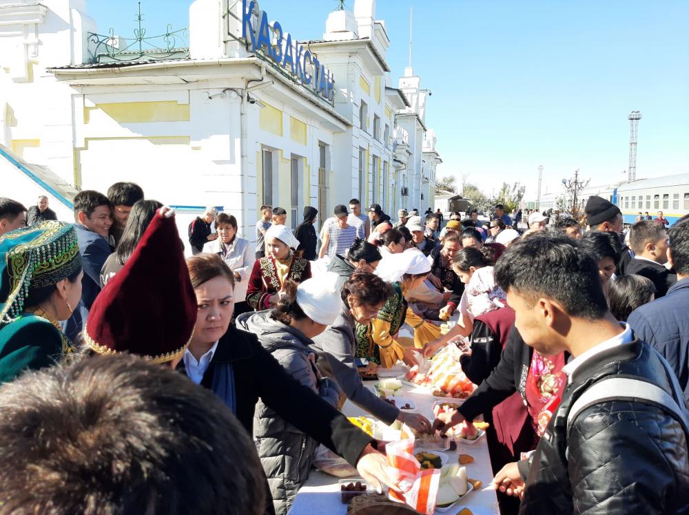 Перронда алдын ала әзірленген ақ дастархан ұлттық дәмнен қайысып тұр. Не жоқ дейсіз мұнда: құрт пен май, қызылкүрең бауырсақ пен майға бөккен шелпек, жент пен майсөк, сырдың мәуесі мен тіл үйірер қауыны мен қарбызы, шипалы шұбаты столды жайнатып жіберген. Сол сәтте перронға аялдаған №23 Алматы-Ақтөбе пойызының жолаушыларын ұлттық киім киген қыздар қарсы алып, дастарханнан дәм ауыз тиюге шақырды. Бұған дейін бірде-бір вокзалға аялдағанда мұндай қызықты кездестірмеген, мұндай қошеметті күтпеген жолаушылар айран-асыр таңқалып жатты. Ал бұның барлығы аймақ теміржолшыларының Республика күні қарсаңында теміржол көлігін қолданушы жолаушыларға жасаған құрметі болатын.