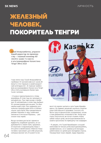 необычный старт. Нас окружала уни- мент это время настало и для Газия Жумаба- помогло мне лучше распределить свои бульском марафоне, где выполнил норма-