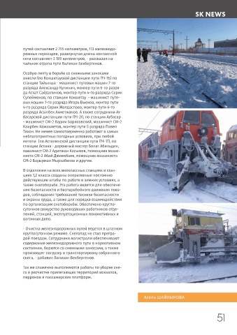 1 было вывезено 226880 кубических метра снега и очищено 12849 км 4-го разряда Серик Жолдаспаев, монтер пути 6-го